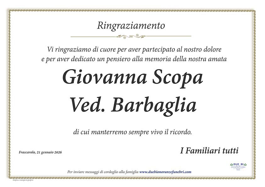 Lascia gratuitamente un messaggio di cordoglio, sarà nostra cura consegnarlo ai congiunti di Giovanna Scopa.